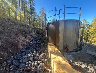 At another key water storage site, aging storage infrastructure was replaced with a new 20,000-gallon bolted steel tank. The site was also regraded and stabilized, and a new access road was constructed to allow crews to safely reach equipment throughout the year.